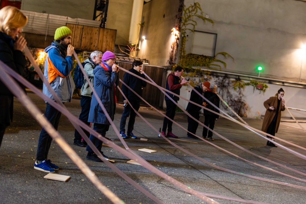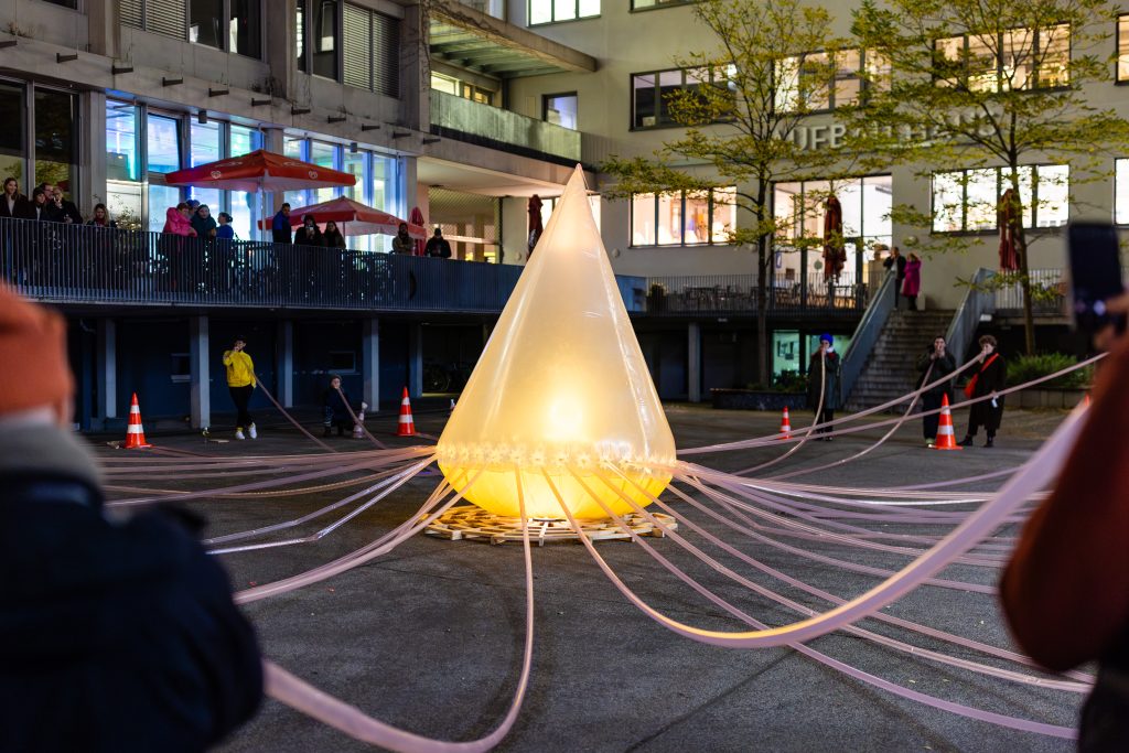 Im Mittelpunkt der Arbeit steht das Atmen als kollektiver Prozess, der eine Luftskulptur entstehen lässt. Die interaktive Skulptur bleibt jedoch porös, sie erreicht keinen endgültigen Zustand und ist für ihre Entfaltung auf den andauernden Einsatz von Vielen angewiesen. Sie hat Atmungsöffnungen für 25 Personen.