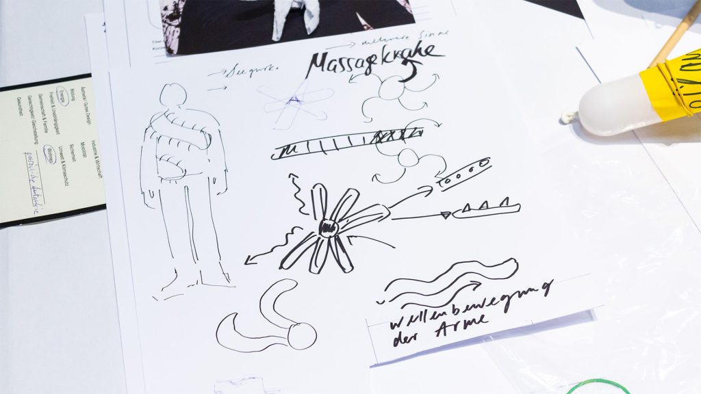 »Wir haben eine Massagekrake entwickelt, die Energie bekommt durch die Haut und sich durch Noppen bewegt und verschiedene Verspannungen am Körper aufnimmt. Innen ist eine Elektrodenverbindung, die Informationen und verschiedene Empfindungen weitergibt. Die Berührung kann rau sein oder weich, also verschiedene Massageeffekte für den Körper haben.«