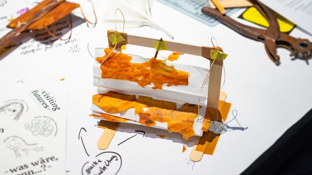 The speculation team designed an adjustable window covering made of paperbark, which could be used to darken interiors. Depending on the light situation, the covering increases or decreases the layers of paperbark to optimally darken a room. The organic structures of the bark would cast shadows in the room and contribute to an aesthetic mood.