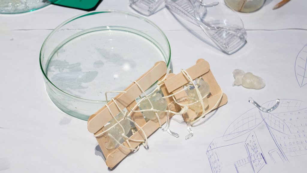 »We thought that the summer of 2050 will be just as hot. And in the city, where it’s also getting hotter and hotter, people could use cool waiting areas. You can imagine it like this: a small bus stop. Instead of walls, it has curtains covered with the materials (hydrogel) so that they have this cooling effect. We also thought of incorporating palm leaves or a palm construction made of thermoactive wires that can be raised or lowered depending on the temperature. The basic idea is to help people and provide cooling spaces without the need for additional energy.«