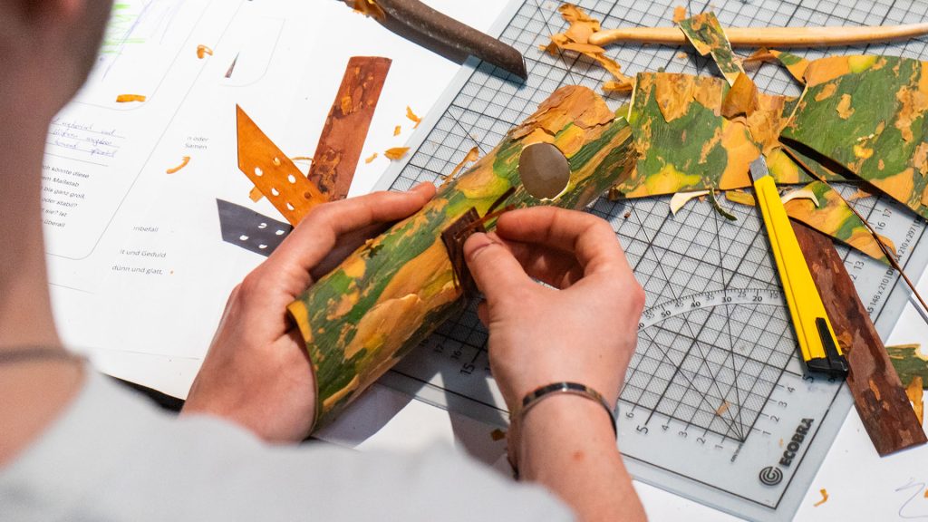 »In this workshop, we mainly produce bandages and orthoses from pine bark, which we add glycerin to so that they remain flexible. Pine bark also has an anti-inflammatory effect and is very cool and soothing. ›Kiefernbruch Hospital‹ therefore has an inherent wellness factor and takes a holistic approach to recovery.«