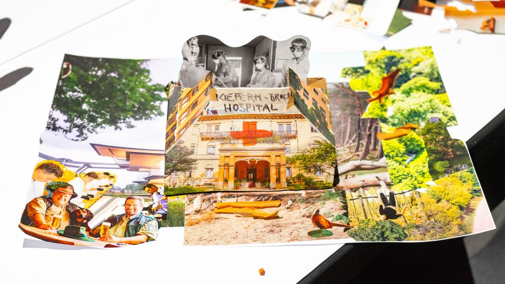 »Welcome! In 25 years, we might have a small accident or break a bone and then find ourselves at ›Kiefernbruch Hospital‹. But we’re fine because our hospital is nestled in a beautiful pine landscape and has a super-cool pine material workshop.«