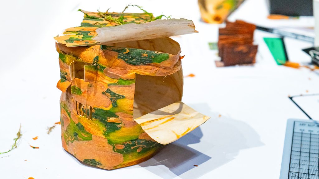 Their idea was to use tree bark as a sustainable material for wallpaper and building facades. Their prototype shows us such a »tree house« from a possible future. It is clear from the house’s round shape that it was inspired by a tree. Many different windows are integrated into the bark facade to ensure good air circulation. The bark’s cooling effect is also intended to lower the indoor temperature and in general make life more comfortable for all living beings in hot inner cities.