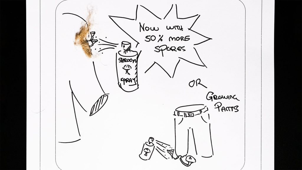 »This ›Shroom Spray‹ contains many spores, which you can spray on your clothes, and after two minutes, your clothes are as good as new. So you can have shirts completely made of fungi. Or you can mend your trousers with ›Shroom Spray‹.«