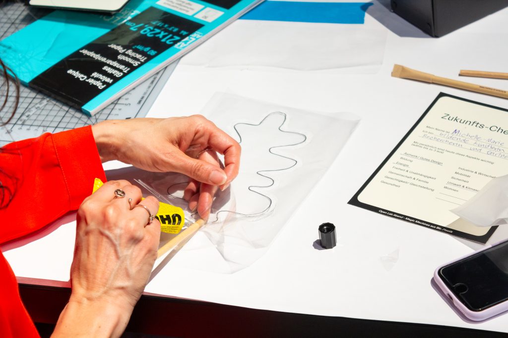 Im dritten Workshop der Serie spekulierten Teilnehmende mit den Designforscherinnen Anna Schäffner und Eva Bullermann darüber, wie die Maschinen der Zukunft gestaltet sein könnten. Ausgangspunkt der gemeinsamen Gestaltung waren flexible Materialien wie Cellulose, Bio-Plastik und Silikon. Die entstandenen spekulativen Magic Machines filterten Verschmutzung aus Luft und Wasser oder halfen beim Verpacken im halbautomatisierten Einzelhandel.
