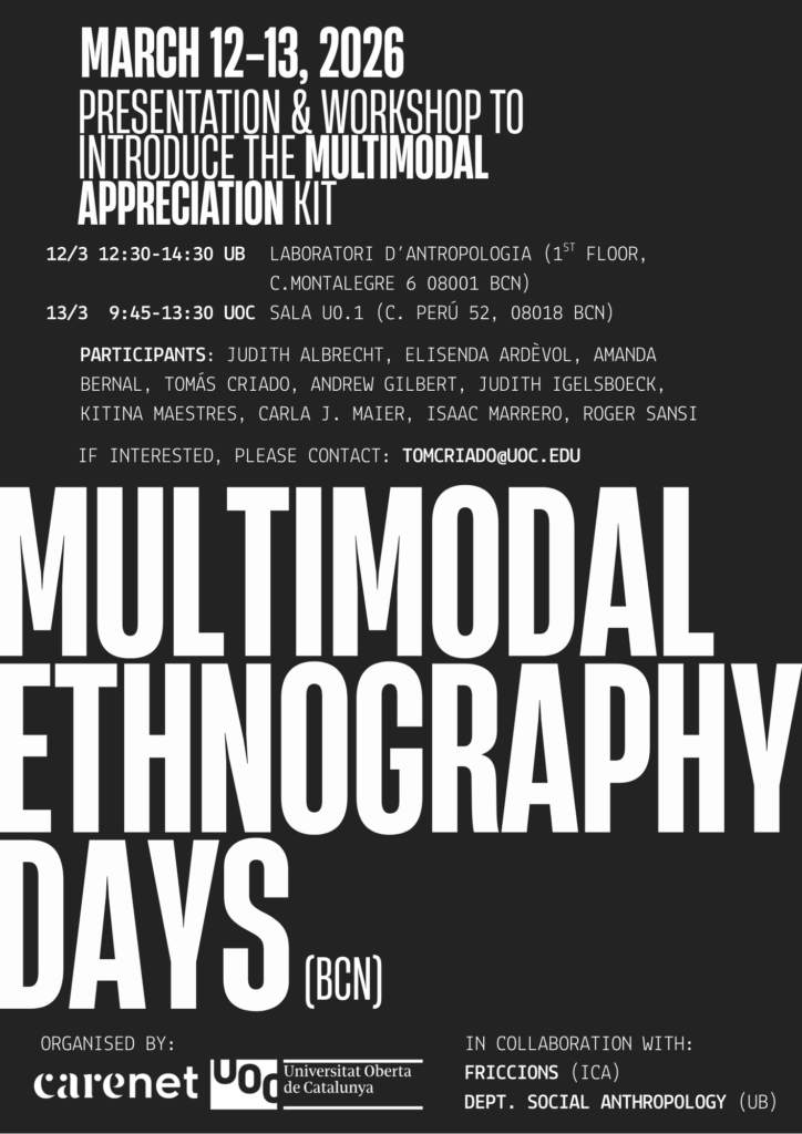 On March 12 and 13, 2026 we held the Multimodal Ethnography Days in Barcelona, organised by Tomás Criado in cooperation with colleagues from CareNet (UOC), Friccions (ICA) and the Department of Social Anthropology (UB).