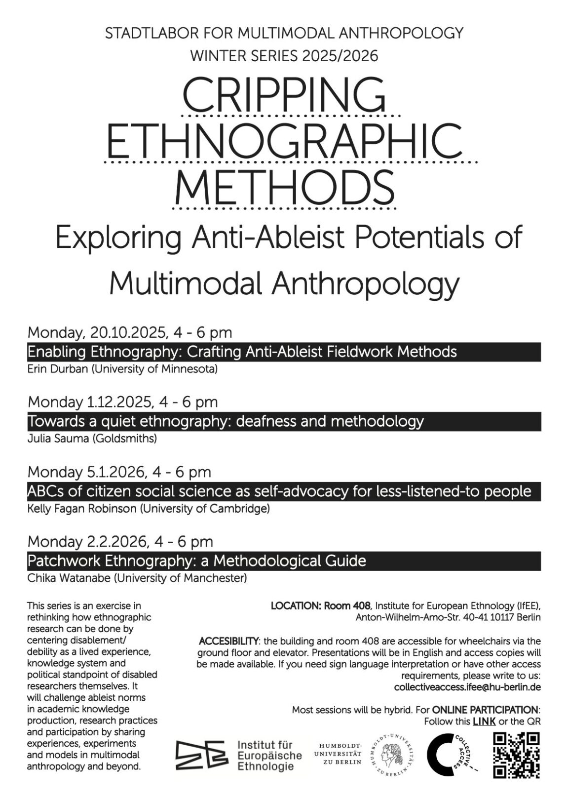 Accessibility: the building and room 408 are accessible for wheelchairs via the ground floor and elevator. Presentations will be in English and access copies will be made available. If you need sign language interpretation or have other access requirements, please write to us: collectiveaccess.ifee@hu-berlin.de.