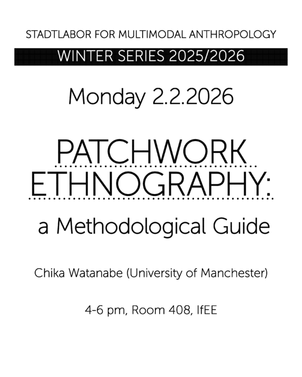 We are delighted to announce our upcoming fourth and final installment for this year’s STADTLABOR FOR MULTIMODAL ANTHROPOLOGY: WINTER SERIES 2025-2026. CRIPPING ETHNOGRAPHIC METHODS: EXPLORING ANTI-ABLEIST POTENTIALS OF MULTIMODAL ANTHROPOLOGY Patchwork Ethnography: a Methodological Guide by Chika Watanabe. 2nd February 2026. 4pm-6pm. Intersecting responsibilities at home, life conditions, institutional pressures, and geopolitical uncertainties make uninterrupted